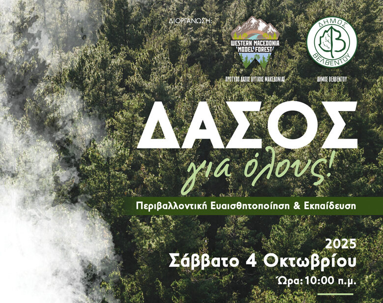 Το Πρότυπο Δάσος Δυτικής Μακεδονίας, σε συνεργασία με τον Δήμο Βελβεντού και με την υποστήριξη του Διεθνούς και Μεσογειακού Δικτύου Πρότυπων Δασών, διοργανώνει το Σάββατο 04 Οκτωβρίου 2025 τη δράση: «Δάσος για Όλους: Εκδρομή Ευαισθητοποίησης, Ενημέρωσης και Δασοθεραπείας», στην περιοχή Σκεπασμένο του Δήμου Βελβεντού.