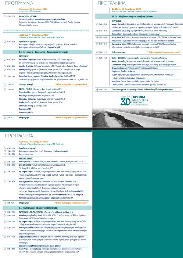 Καταξιωμένοι εισηγητές από το Αριστοτέλειο Πανεπιστήμιο Θεσσαλονίκης, το Πανεπιστήμιο Δυτικής Μακεδονίας, τον ΟΑΣΠ, την ΕΑΓΜΕ, το ΙΤΣΑΚ, τις Ένοπλες Δυνάμεις, τα Σώματα Ασφαλείας και το ΕΚΑΒ θα αναφερθούν τόσο στον σεισμό του 1995 σε Γρεβενά και Κοζάνη, όσο και στα διαθέσιμα εργαλεία που αφορούν στην πρόληψη και στην εκπαίδευση σχετικά με τη διαχείριση κρίσεων.