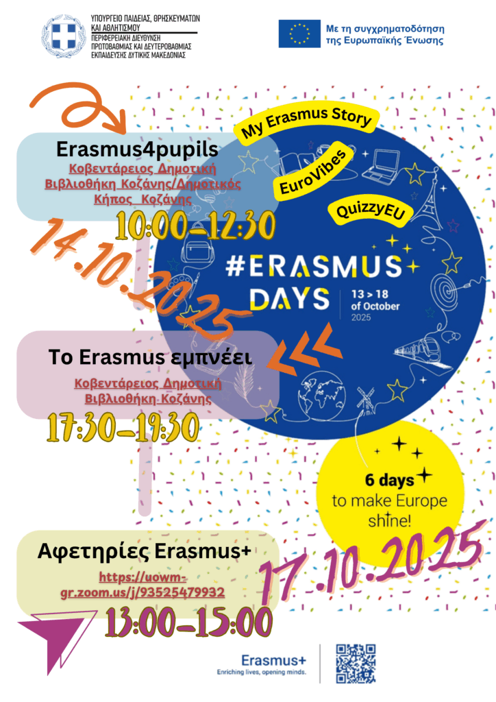 - Erasmus4pupils: Τρίτη 14.10.2025, 10:00-12:30 στην Κοβεντάρειο Δημοτική Βιβλιοθήκη Κοζάνης/Δημοτικό Πάρκο Κοζάνης