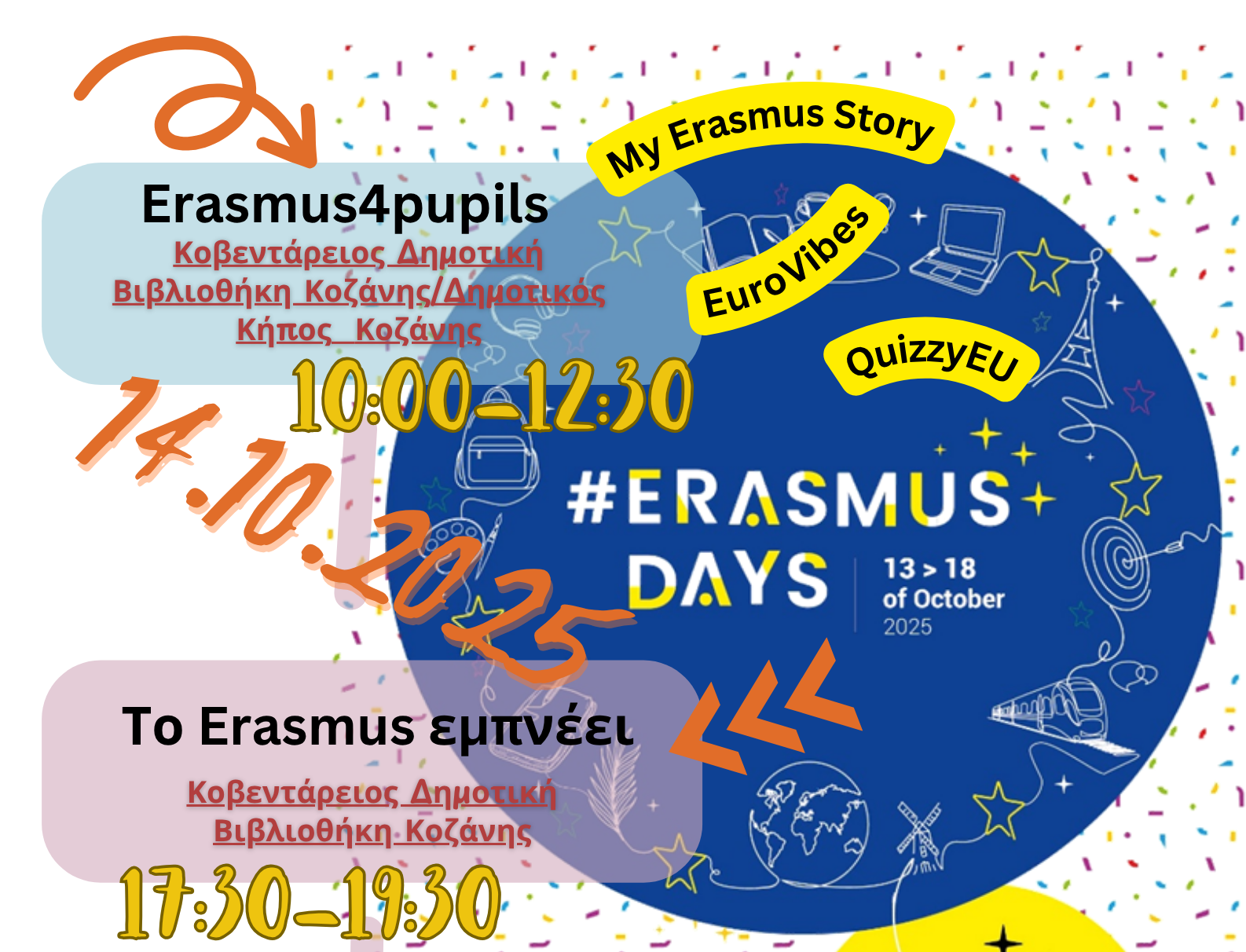- Erasmus4pupils: Τρίτη 14.10.2025, 10:00-12:30 στην Κοβεντάρειο Δημοτική Βιβλιοθήκη Κοζάνης/Δημοτικό Πάρκο Κοζάνης