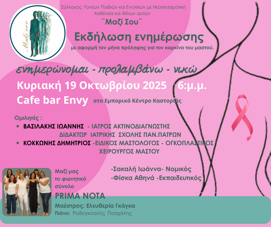 Ο Σύλλογος Γονέων Παιδιών και Ενηλίκων με Νεοπλασματική Ασθένεια και Φίλων αυτών ¨Μαζί Σου¨σας προσκαλεί να συμμετάσχετε σε ακόμα μια Εκδήλωση  αφιερωμένη στον Μήνα Πρόληψης για τον Καρκίνο του Μαστού με ομιλητές τους: