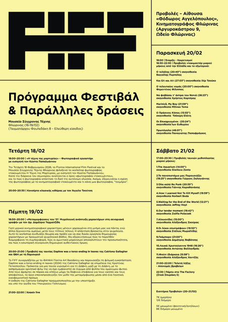 20:00–21:00 | Προβολή της ταινίας Daphne was a torso ending in leaves της Catriona Gallagher και Q&A με τη δημιουργό